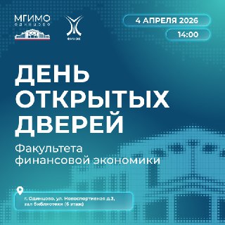 4 апреля в кампусе МГИМО-Одинцово состоится День открытых дверей Факультета финансовой экономики МГИМO. Директор Одинцовского филиала МГИМО Е.А. Козловская, декан факультета И.А.Гулиев, руководители образовательных программ, ответственный секретарь приемной комиссии Е.А.Литвинова , расскажут актуальную информацию о приемной кампании 2026 года, об особенностях обучения на образовательных программах факультета, учебном процессе, стажировках и перспективах трудоустройства.